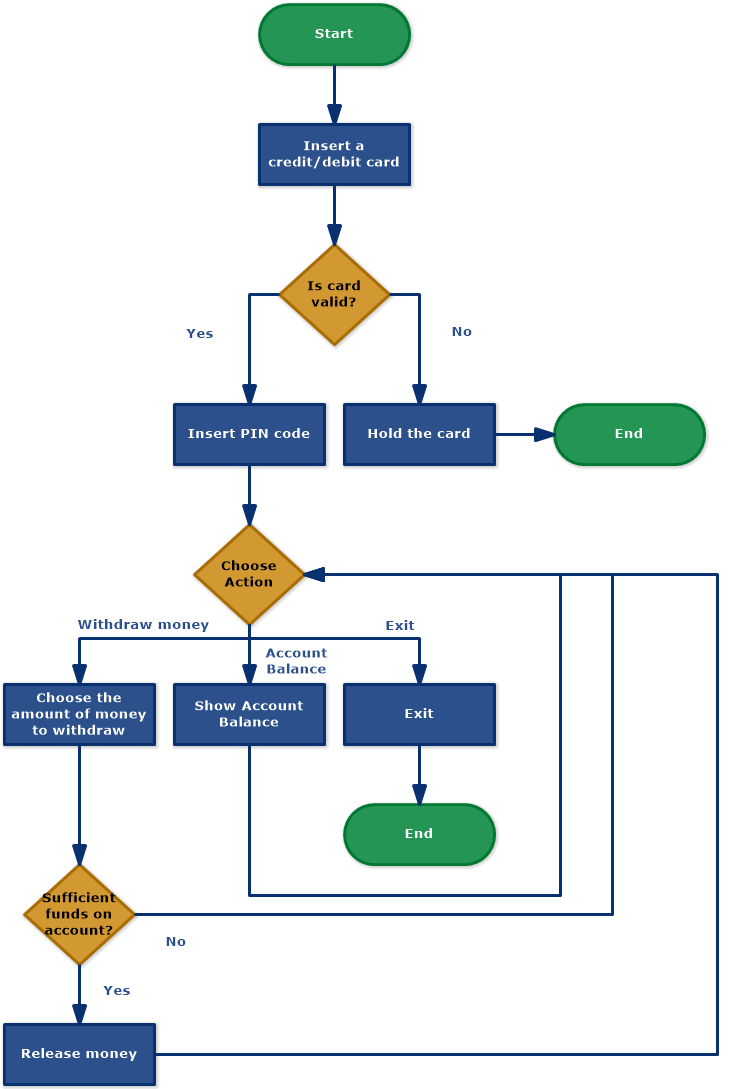 How does atm work explain through a diagram - The ATM system uses high-speed transmission 155 Mbps and is a connection-based system. If the cardholder requests the cash the host processor takes the cash from the cardholders account. Use case diagrams are used at the development of software and systems for definition of functional system requirements or system of systems. When the customer is through performing transactions the card is ejected from the machine and the session ends.